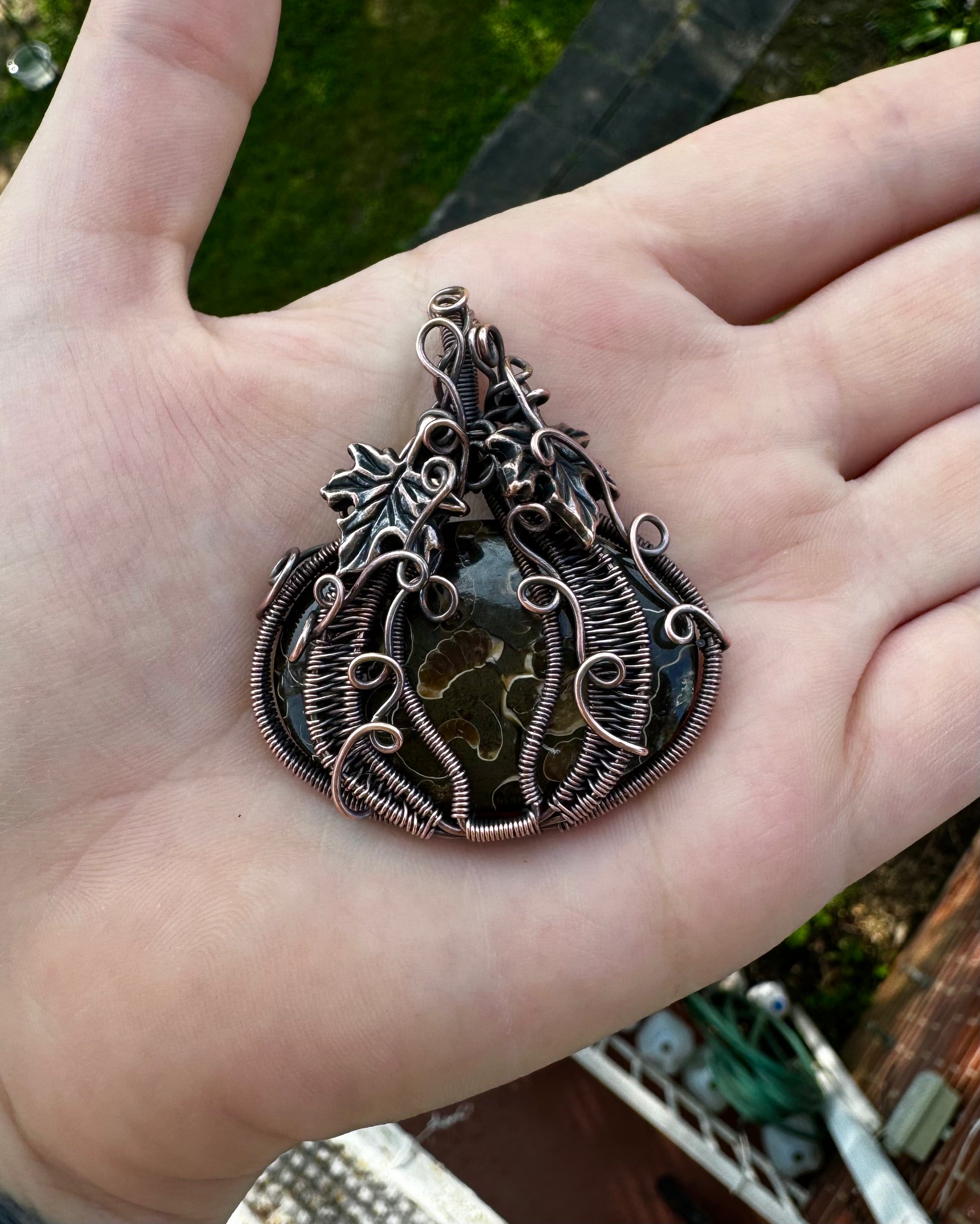 Copper wire-wrapped fossil Pendant